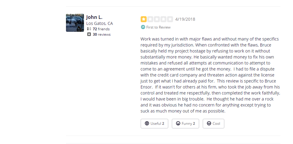 On 10-19-2020, after an email asking for a phone conference from Bruce Ensor, talked to Bruce about the time approaching 90 days since payment. He was not sorry or sympathetic, he is definitely lacking some basic customer skills. I gave him a ultimatum for a week to be done. This is when it got worse. The plan sets that started coming through were not physically possible. One major point was he had me welding large steel beams to the bottom of the containers. The containers would have to be flipped on their tops and all 4 welded and flipped back based on the way the containers are made. Remember, they are all built the same based on the ISO standard. Find me a crane that can do that! I had given him pictures of a 2 story, 8 unit apartment complex in phoenix made from the same containers with none of this extra material.